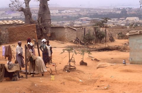 Women and children hanging laundry; Sambizanga Musseque