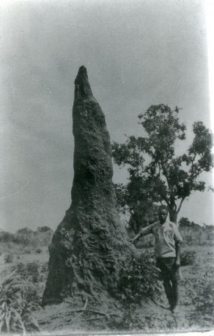 Archival photo of man next to termite hill